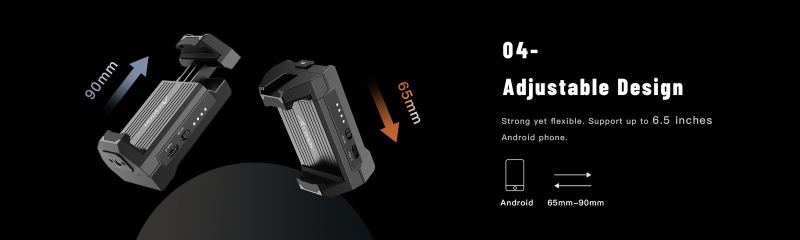 • Adjustable clamp supports phones 65–90 mm wide