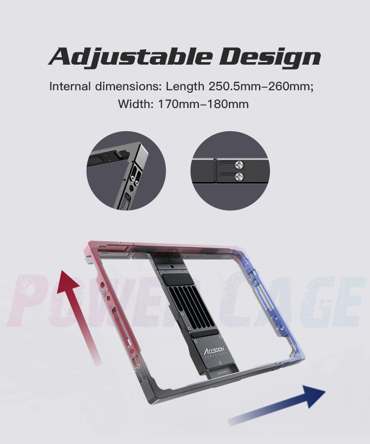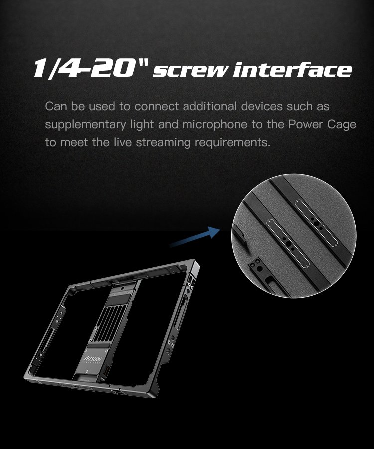 | Multiple 1/4″ screw interfaces can be used to connect additional devices such as light and microphone to the Power Cage to meet the live streaming requirements. | |