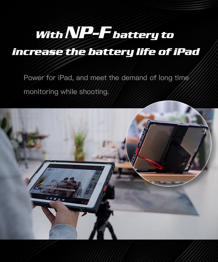 Power for iPad, increase the battery life of iPad, and meet the demand of long time shooting and monitoring. |