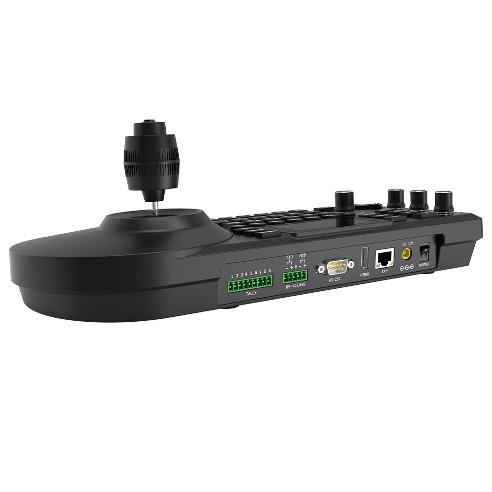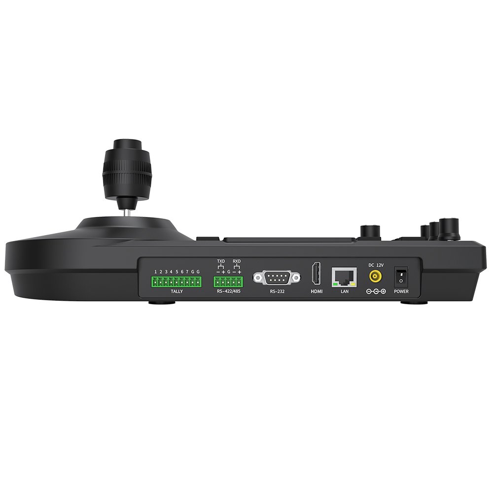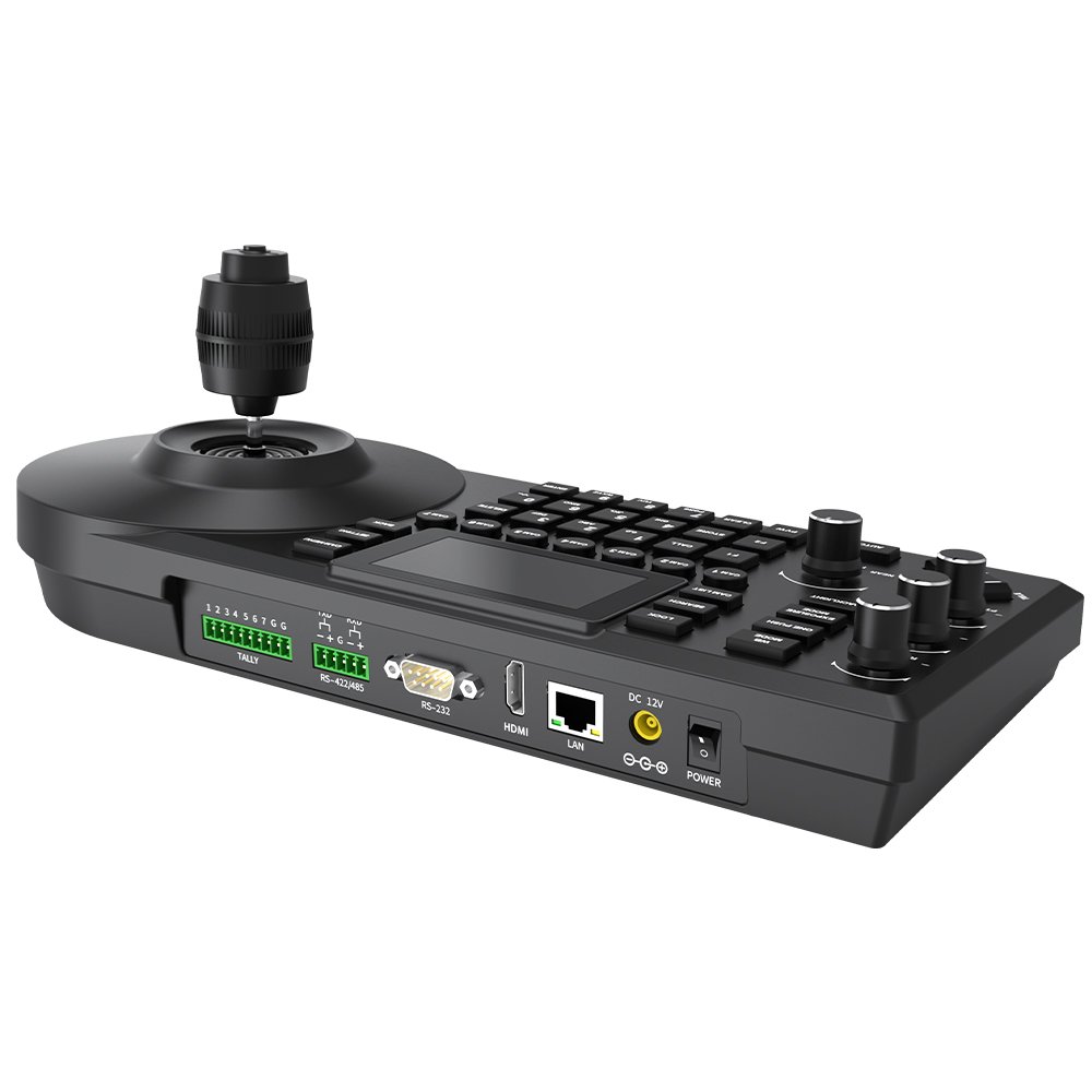 A professional NDI PTZ remote controller featuring joystick control, live preview via NDI | HX, 4K30 HDMI output, multi-protocol camera support, and an intuitive LCD interface — built for broadcast, live events, and studio control rooms.