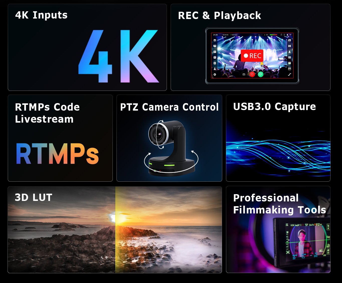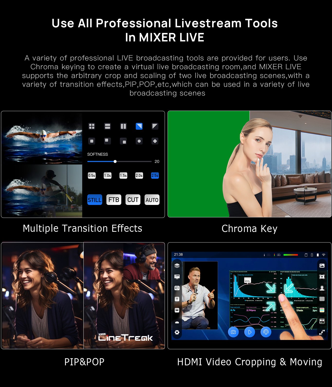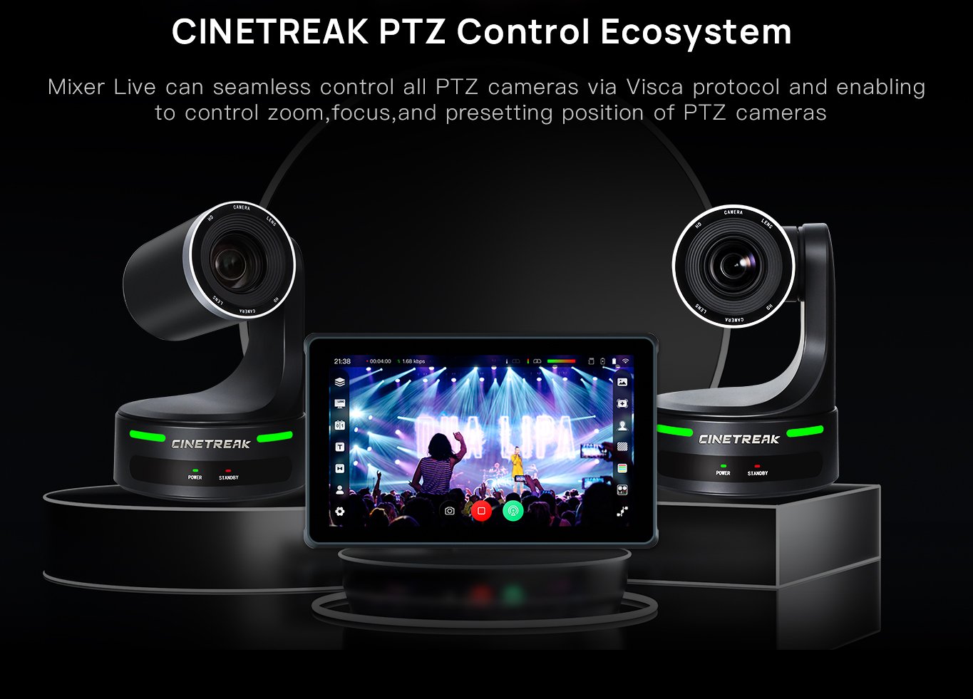 The CineTreak Mixer Live 2 is a portable all-in-one 4K HDMI live streaming and recording switcher that brings professional broadcast tools — such as touchscreen control, PTZ camera support, vertical streaming, subtitles/scoreboard, and visual effects — into a compact livestreaming hub for creators, filmmakers, and content producers.