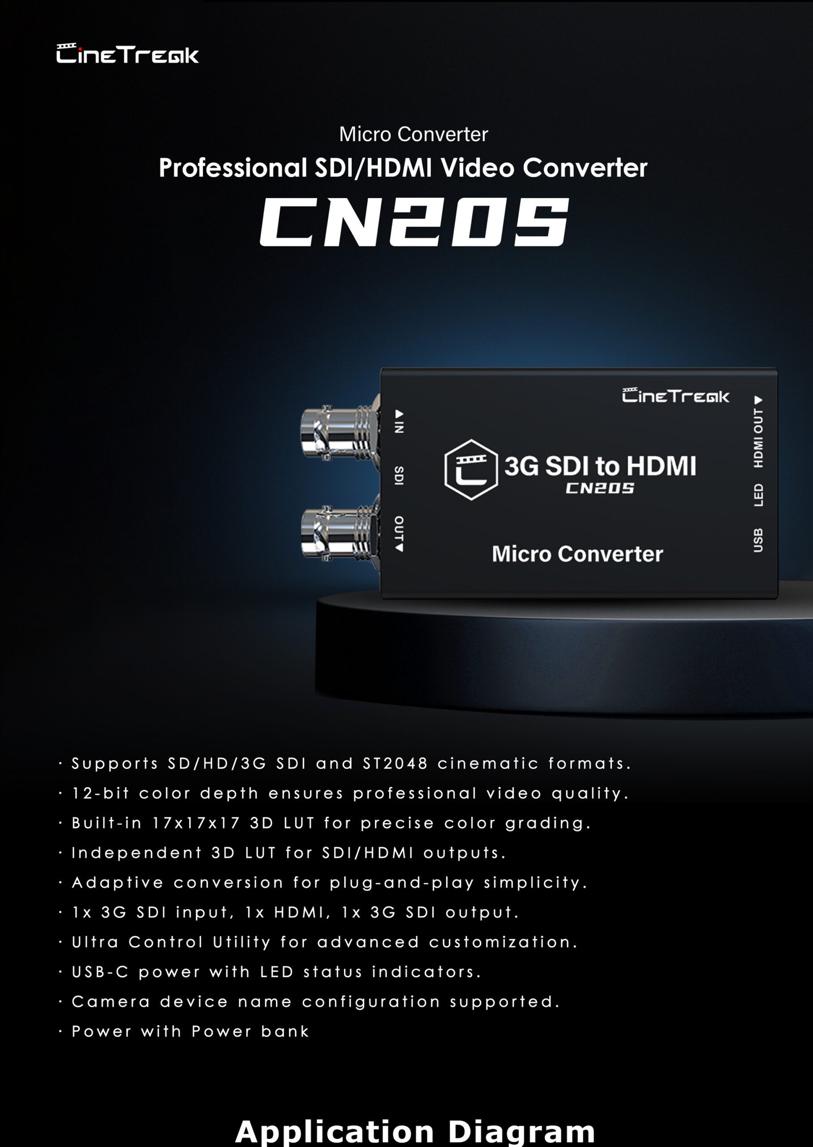 CineTreak CN20S is a professional-grade 3G SDI to HDMI micro converter designed for broadcast, live production, and studio workflows. Featuring 12-bit color depth, built-in 3D-LUT processing, and wide SDI format support, it delivers accurate color reproduction, low-latency signal conversion, and reliable performance for cameras, switchers, monitors, and livestream systems.