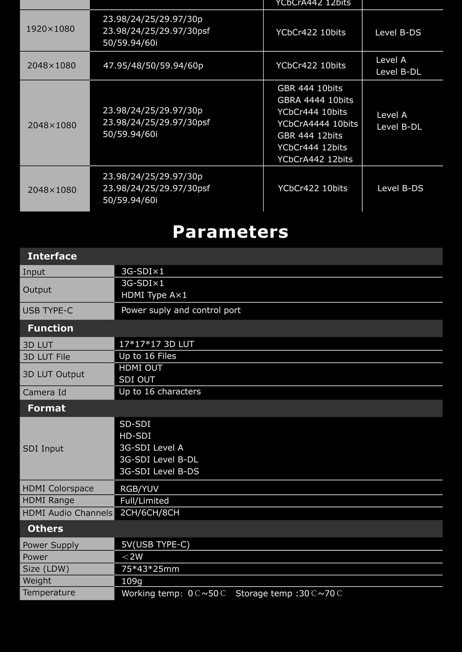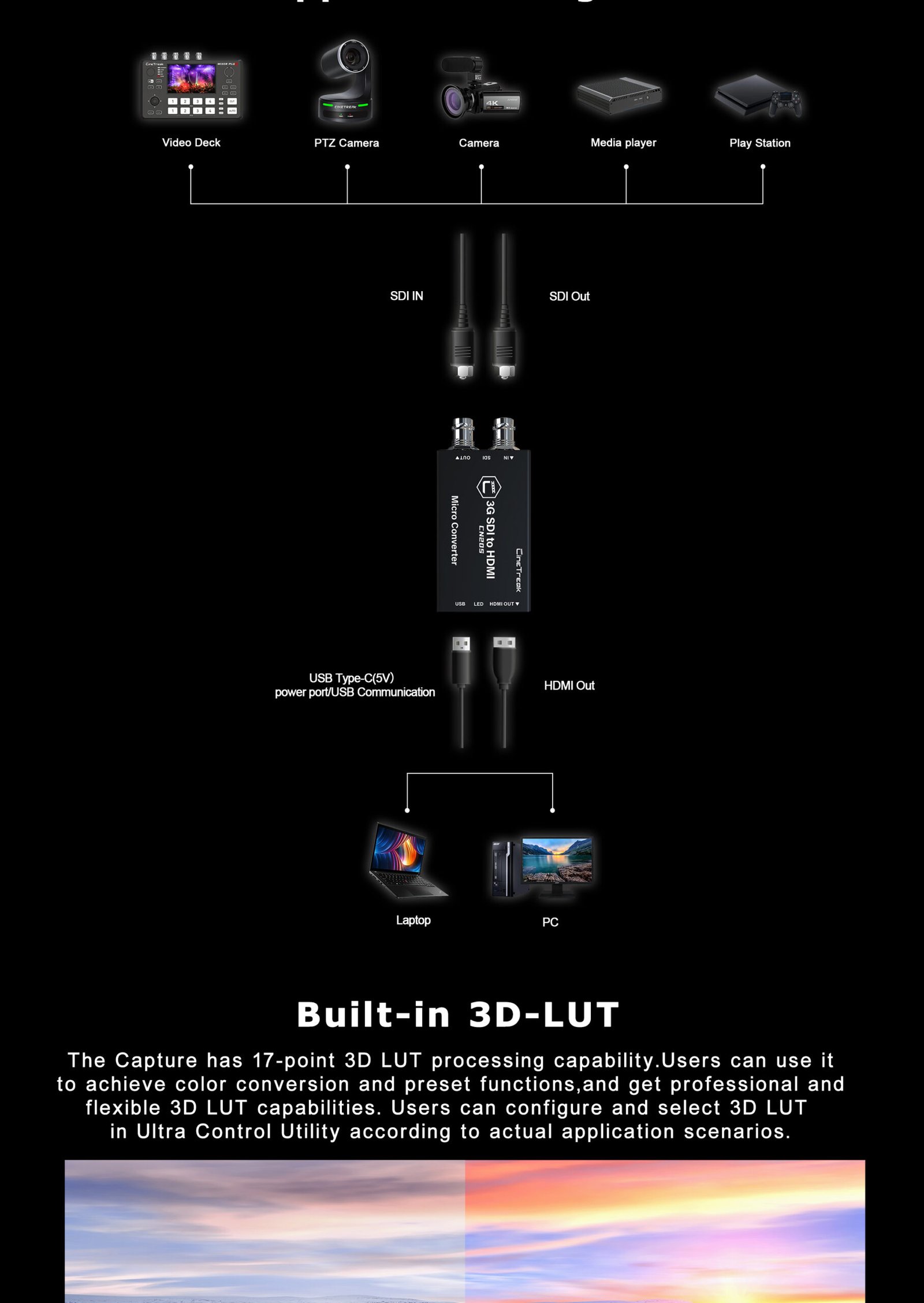 • Built-in 17×17×17 3D-LUT for color grading and monitoring