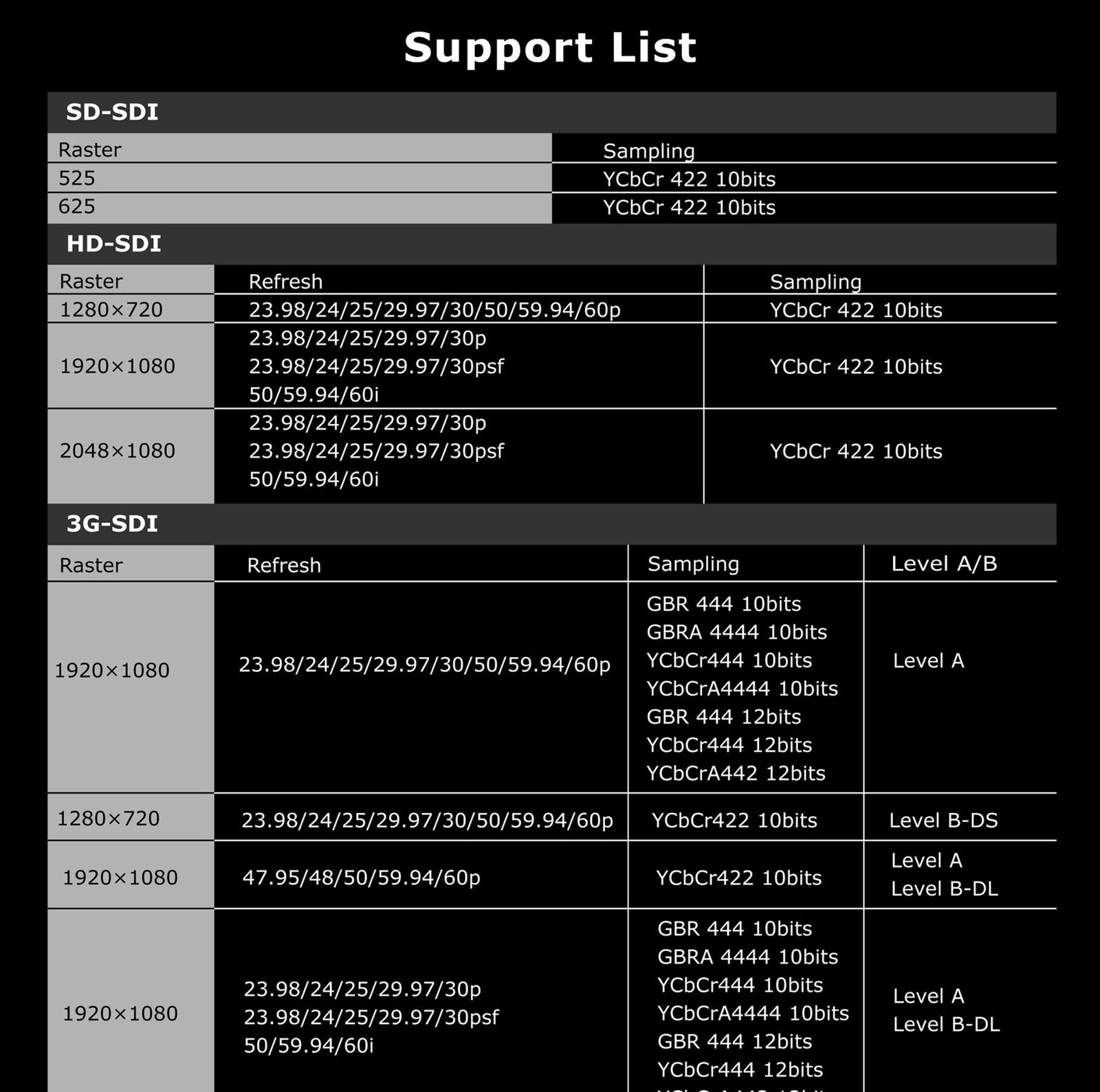 • Supports SD-SDI, HD-SDI, and 3G-SDI (SMPTE formats)