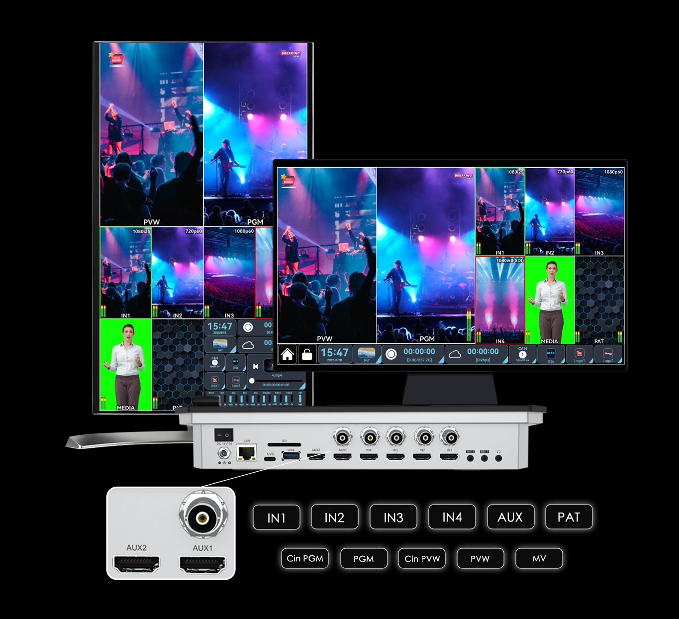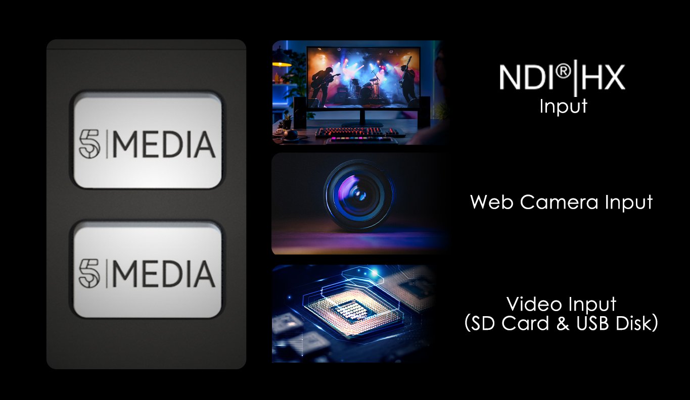 • Built-in multimedia channel supporting NDI, USB, and file inputs
