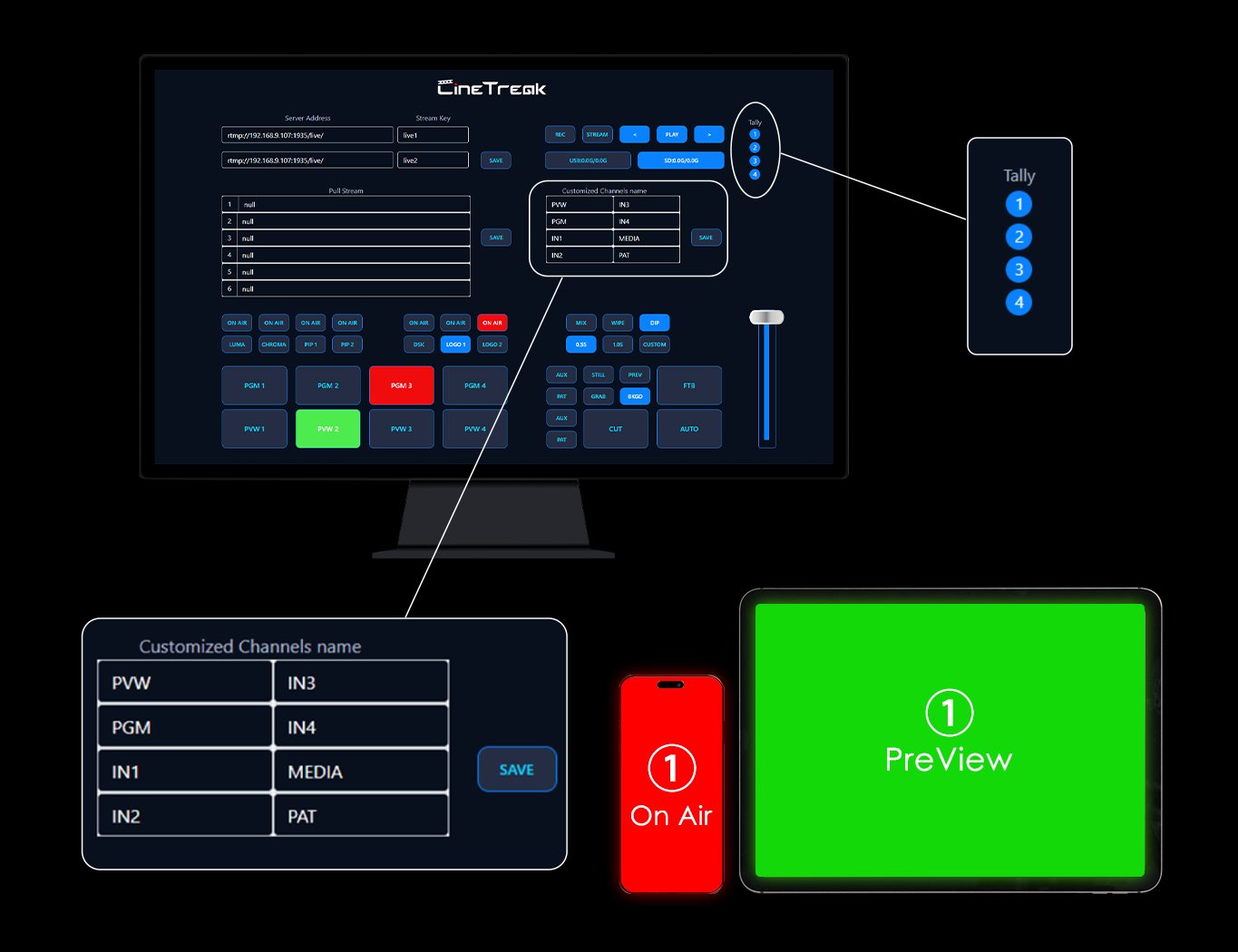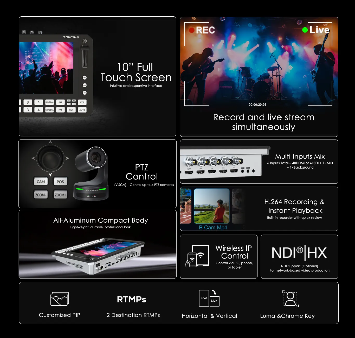 The CineTreak Touch-S is an all-in-one touchscreen video switcher designed for live streaming, multi-camera production, broadcasting, and hybrid events. Featuring a responsive 10-inch full touchscreen, flexible input options (HDMI/SDI), advanced multi-window modes, and powerful remote control capabilities, it delivers intuitive and professional live production workflows for creators, studios, corporate events, and educational broadcasts.